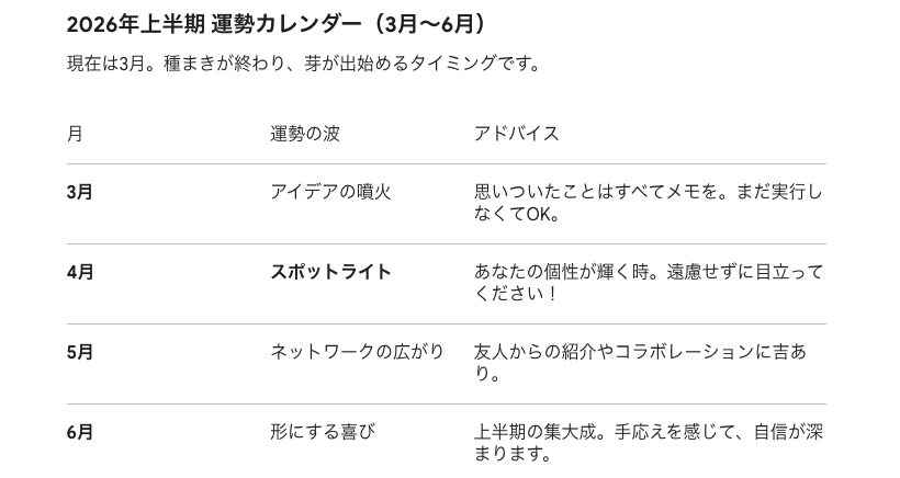 - チャンスの兆し: 4月頃、あなたのユニークなアイデアが評価されたり、SNSや発信活動が注目を浴びたりする可能性があります。